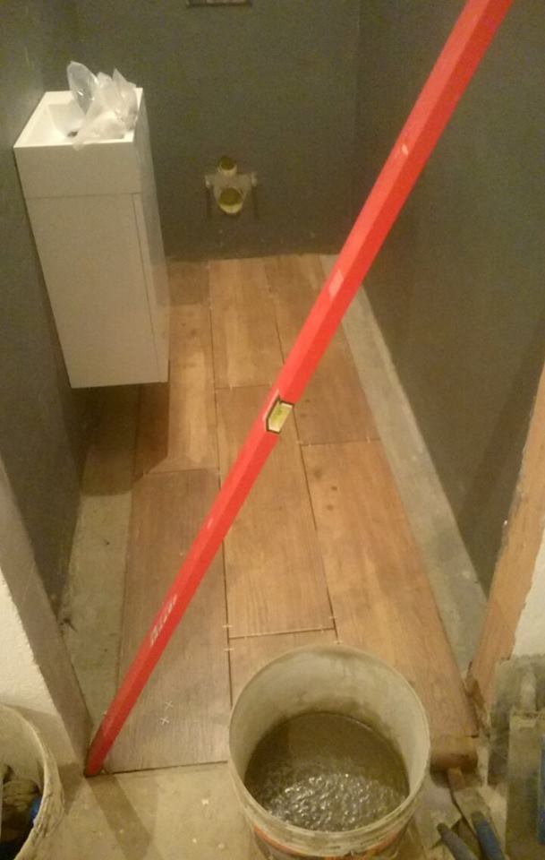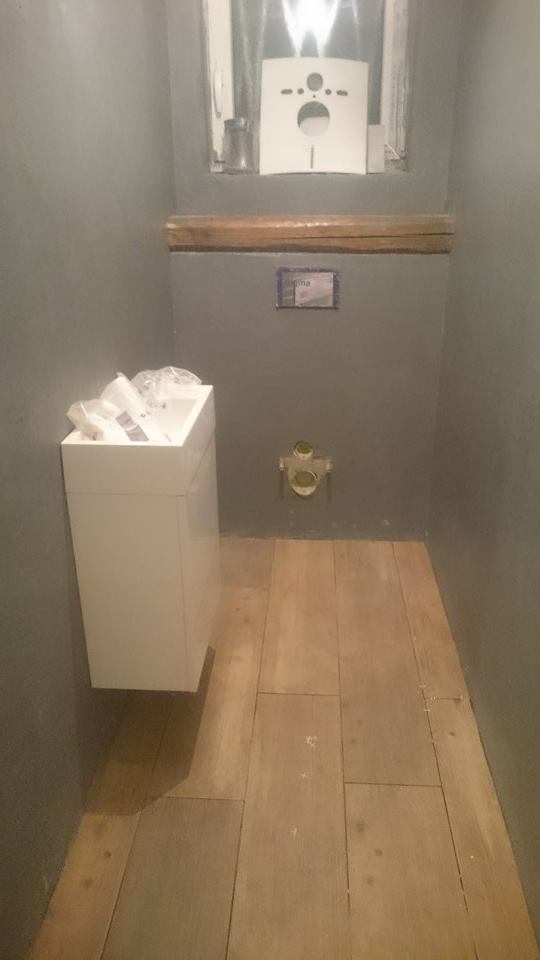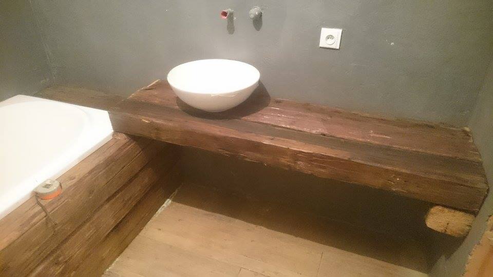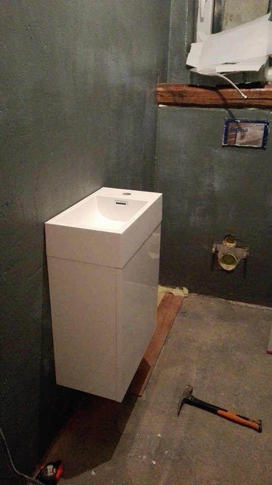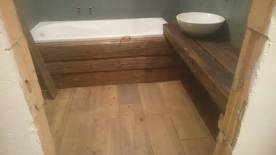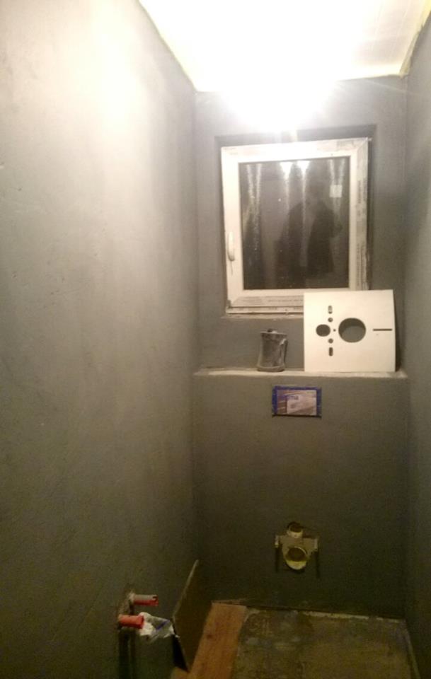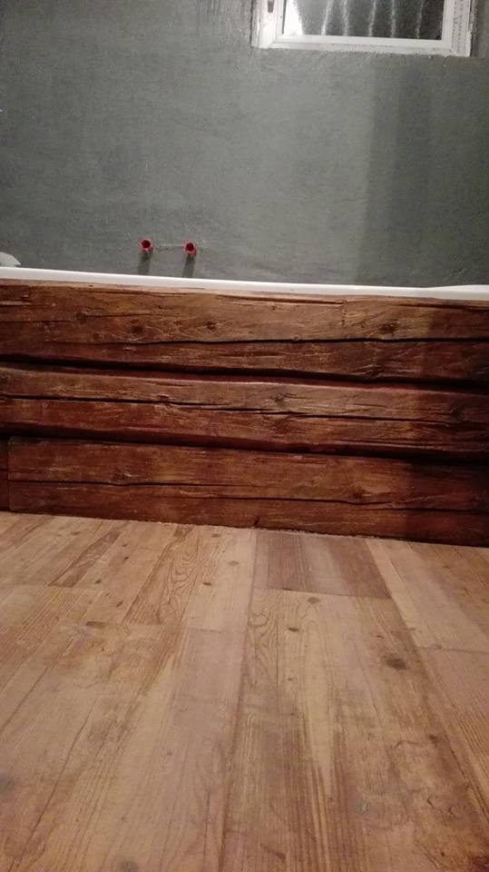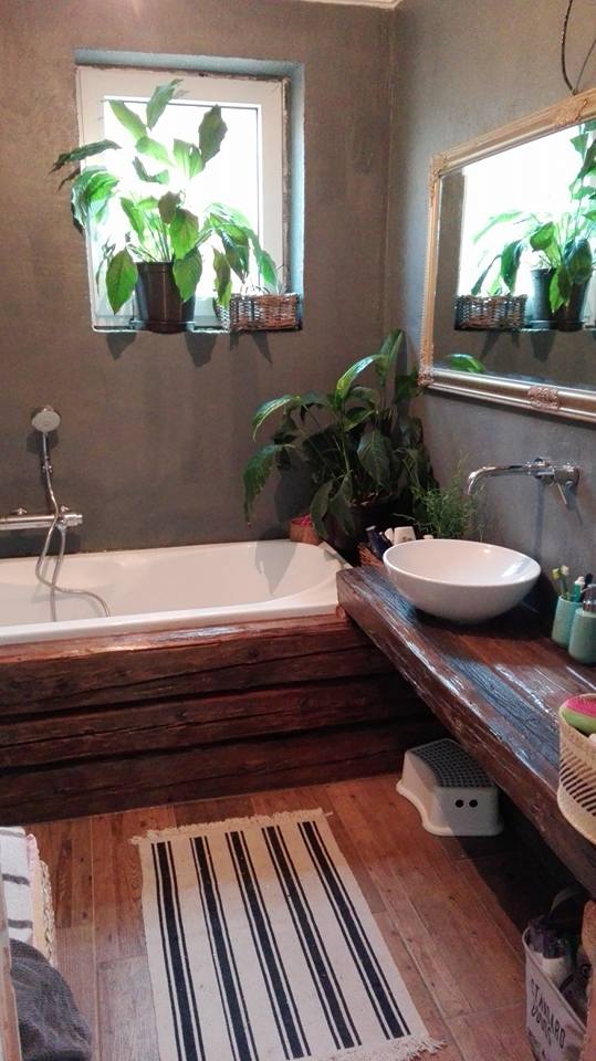 Odjakživa sním o koupelne bez kachliček a spár, a díkybohu za betonové stěrky. Nicméně tzv. "facebeton" je nad naše poměry ( 2500kč/m2) a tak hleáme alternativu. Po různých průzkumech volíme hydroizolační stěrku s tónem tmavě šedé a na to příjde lak na stěny, který je omyvatelný a otěruvzdorný, vytvoří na povrchu zdi lesklý film, a přitom zanechá vlastnosti zdí jak má. Jelikož nám zbylo hodně starých trámů po bourání a chceme zachovat v moderním interiéru odkaz starého domu, bude vana obložena trámy, stejně tak z trámů deska pod umyvadlo a polise na WC. Vše doplněno bílou, opět bílé stropy z palubek.