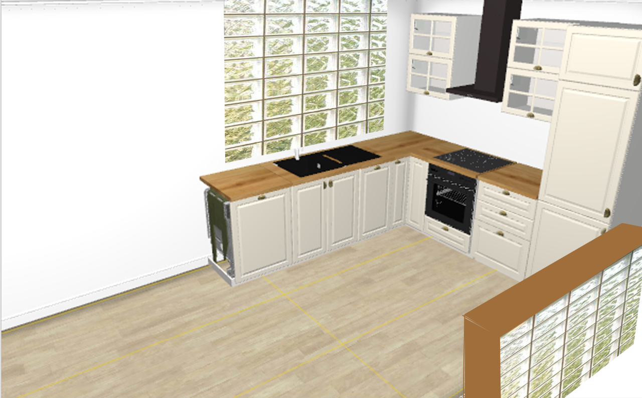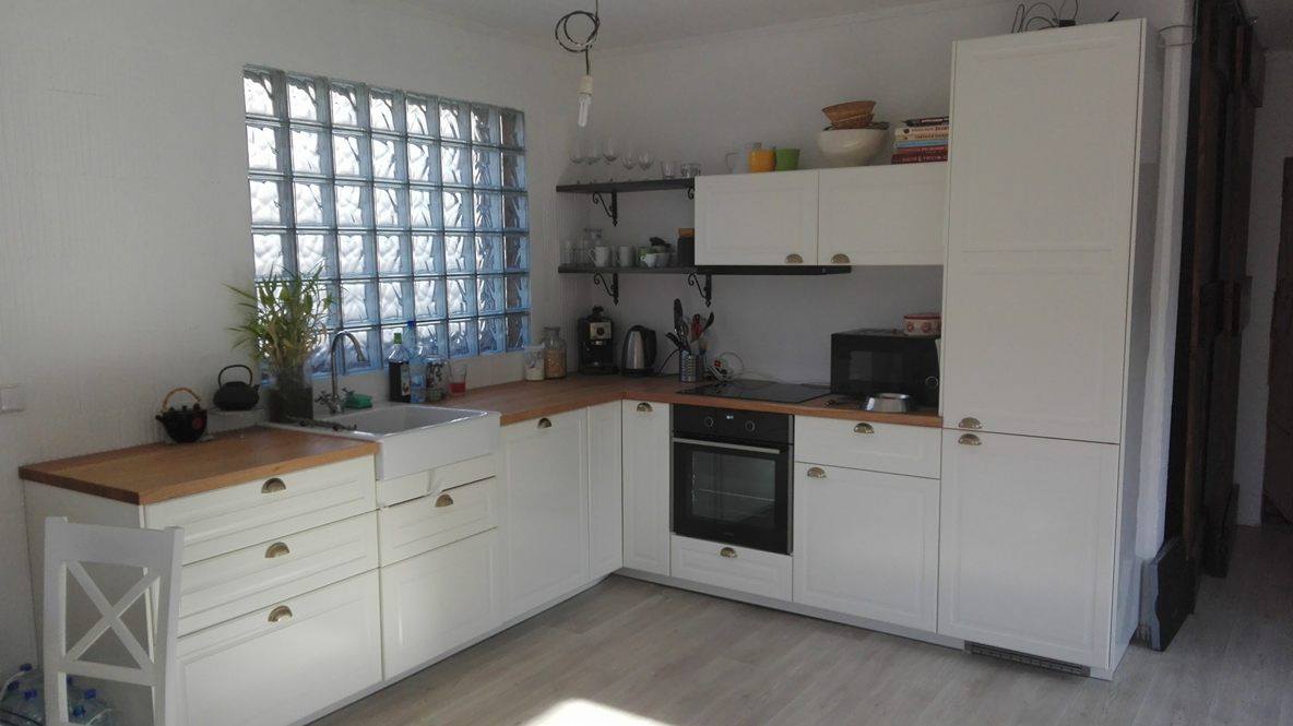 kuchyně do L s ostrůvkem z luxfer, stejné luxfery jsou použity na kuchňské okno. Kuchyně z IKEA značka Bodbyn, krémová, pracovní deska Dub masiv. Spotřebiče vestavěné, Gorenje (myčka, lednice, trouba, deska, digestoř)- cena 80 000,- kuchyňská linka 40 000,-